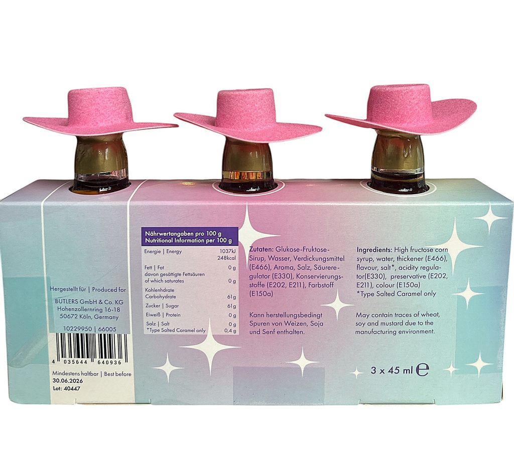 Vanilka, slaný karamel a lieskový oriešok: tri neodolateľné príchute v jednom kúzelnom balení s ružovým kovbojským klobúkom. Perfektný doplnok ku káve, čaju alebo dezertom, ktorý Vám zaručene vykúzli úsmev na tvári. Stačí jedna kvapka a chutné dobrodružstvo začína!