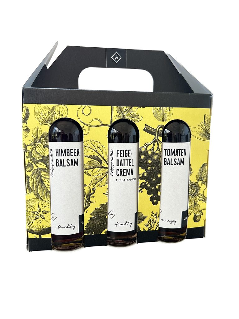 Paradajkový balsamico: prípravok z octu, 5% kyslosť. Zloženie: biely vínny ocot, voda, cukor, Aceto Balsamico di Modena (G.g.A.) (vínny ocot, koncentrát hroznovej šťavy), 5% paradajková šťava z koncentrátu, karamelový sirup, prírodná aróma, antioxidant: metabisulfit draselný.