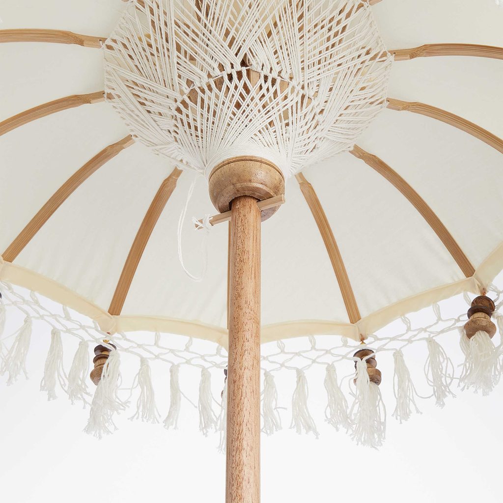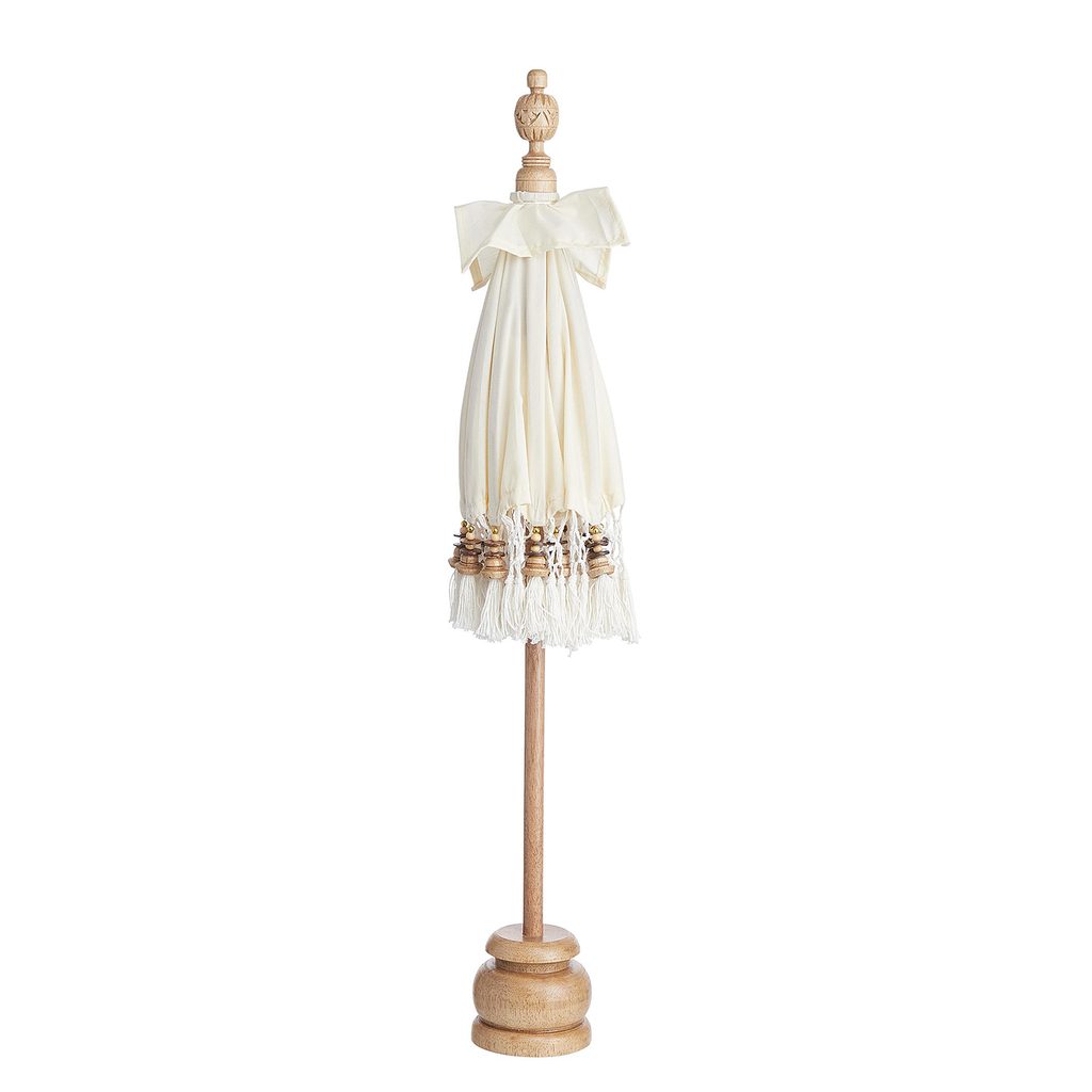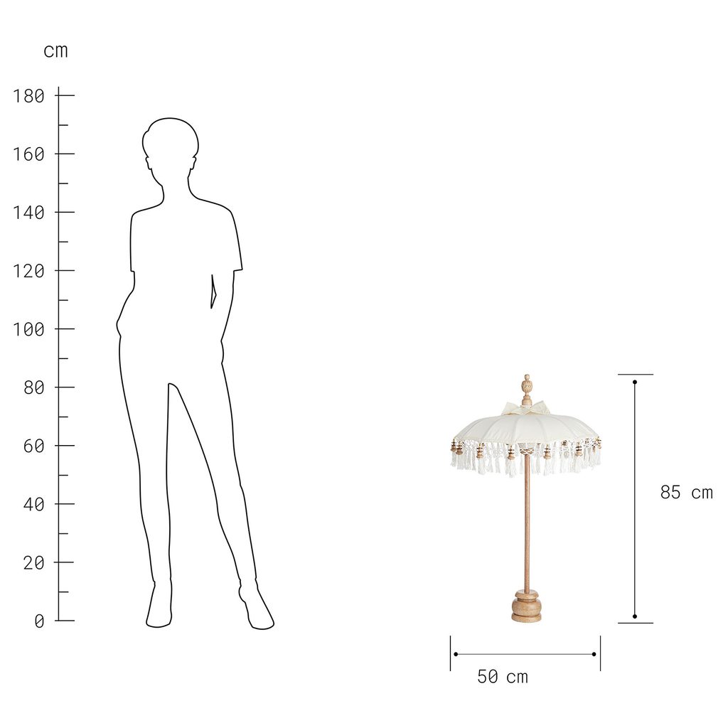 Stolové dekorácia MACRAMÉ v podobe mini slnečníka zatieni takmer čokoľvek, čo za krásneho počasia na vonkajšom prestretom stole nájdete: napríklad pokrmy, nápoje. Avšak aj vzhľad a spracovanie tohto doplnku nie je len tak hocijaké: tento mini slnečník bol vyrobený tradičným ručným remeslom, ručne vyrezaný a pomaľovaný na ostrove Bali. Bavlnený poťah zdobia aplikácie z hliníka, ako ďalšie materiály asistujú bambus a mangové drevo. To všetko z neho robí skutočný klenot a hviezdu Vašich slnečných dní aj teplých vlahých nocí. Nie je vodeodolné.