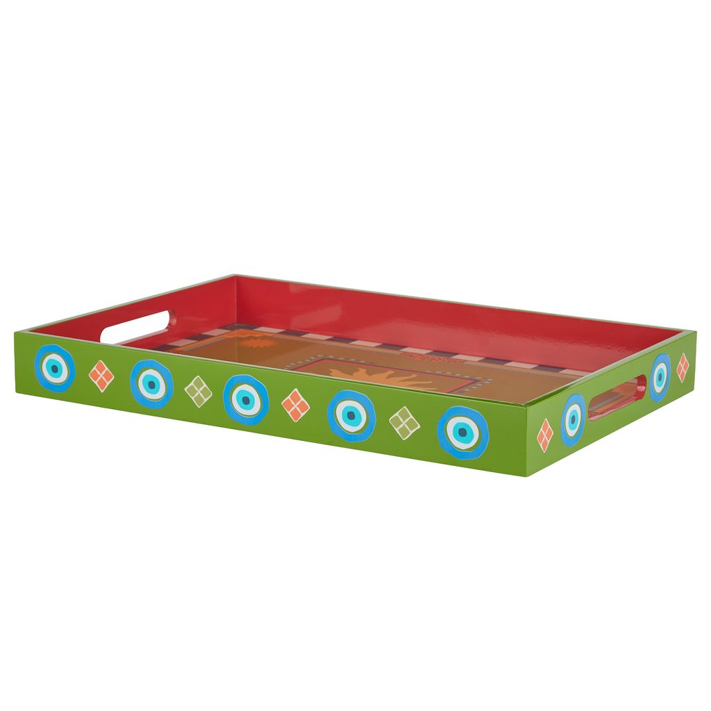Farebný dekoratívny podnos NAZAR s etno vzorom je ideálnym podstavcom pre dekoratívne vázy, svietniky alebo iné doplnky. Stačí zvýrazniť etno štýl alebo jednu z farieb vzoru a získate jedinečný kúsok, ktorý oživí Váš domov.