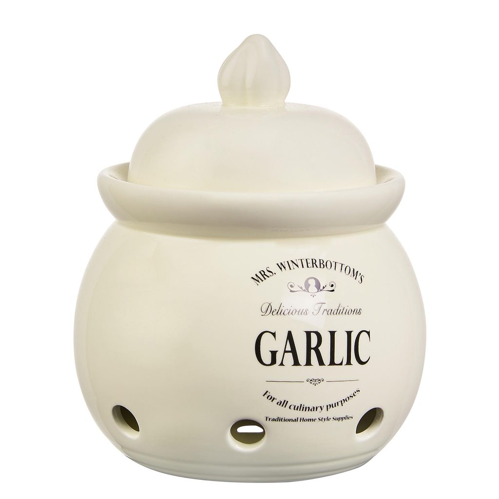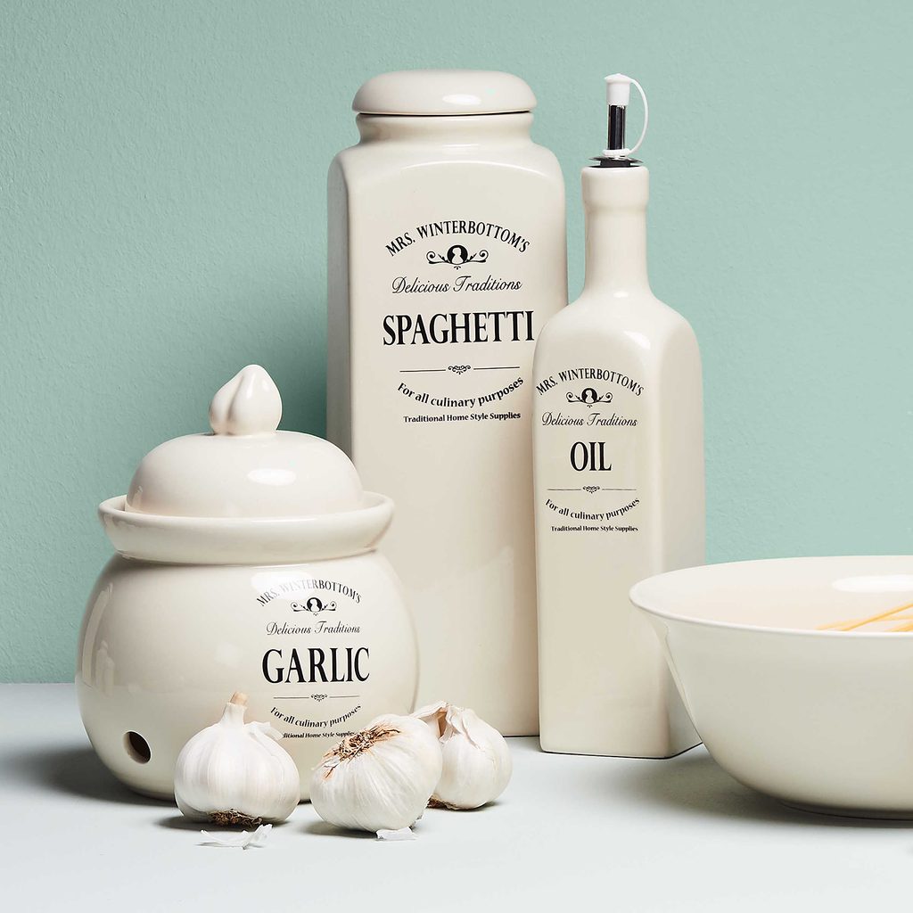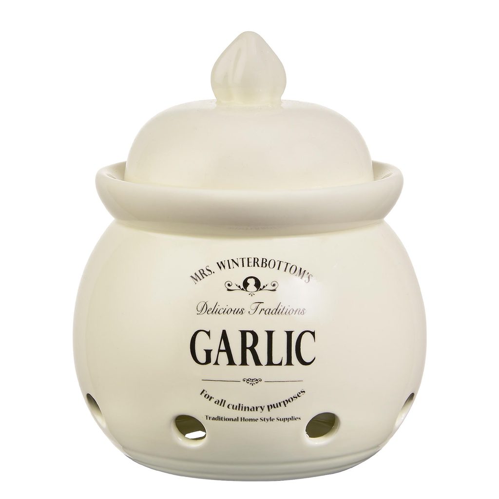 Paličky cesnaku, ktoré sa nezmestia dovnútra, často zozelenejú závisťou. Uchovávajte ho ako sa patrí v dóze na cesnak s vetracími otvormi. Rada MRS. WINTERBOTTOMS myslí na každého a na všetko. Uchovať alebo servírovať na stôl sa dá vďaka tradičným dózam, fľašiam, hrncom, miskám, konvičkám prakticky čokoľvek. Vyrobené z kameniny exkluzívne pre Butlers, s typickým anglickým dekorom. A samozrejme k sebe všetko padne tak ako pokrievka na hrniec alebo lievik do hrdla fľaše.