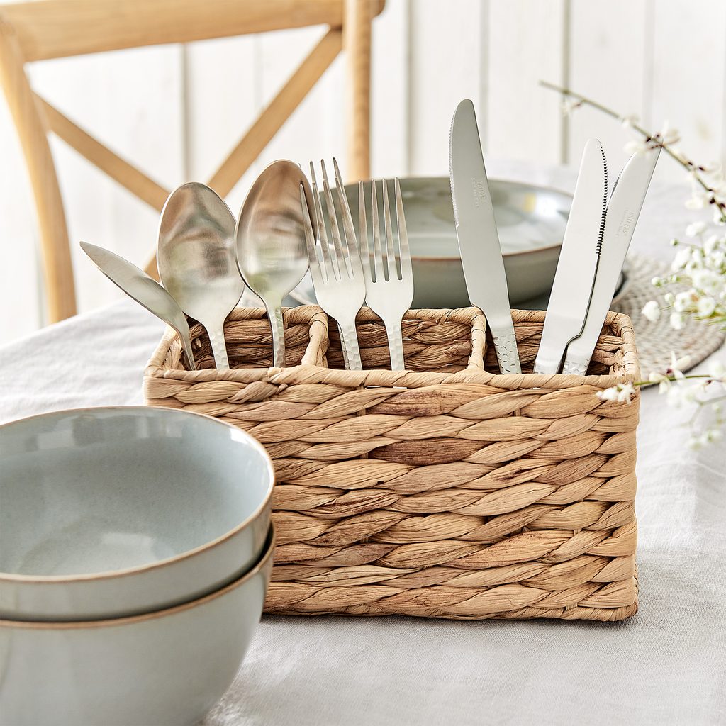 Zabudnite na formálnosť. Prineste na grilovačku alebo brunch príbory k stolu ľahko a bez ťažkostí v našom košíku na príbory RUSH ROPE v prírodnom odtieni vodného hyacintu. Tri priehradky poskytujú dostatok priestoru a poriadok pre nože, vidličky aj lyžice a všetci sa pekne šikovne môžu obslúžiť sami. Alebo príbory predpríprava a set príboru vždy zabaľte do obrúskov.