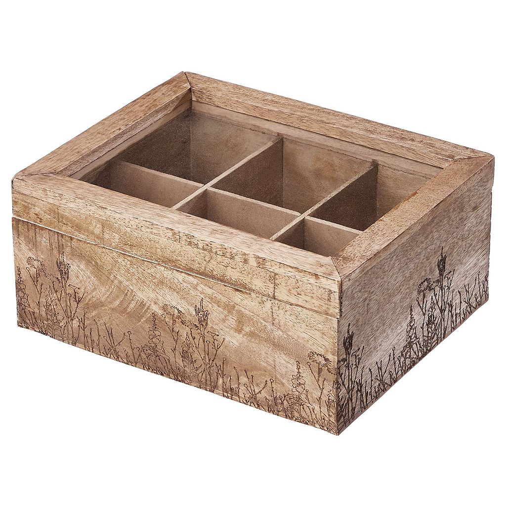 Všetky Vaše čaje po ruke: v čajovej krabičke TEA TIME s gravírovanými kvetmi z hnedého mangového dreva môžete dekoratívnym spôsobom uložiť veľa čajových sáčkov. Krabička je tak krásná, že ju môžete nechať na raňajkovom stole alebo na kuchynskej linke a vykúzli Vám jarnú atmosféru a úsměv na tvári pri každom pití čaju.