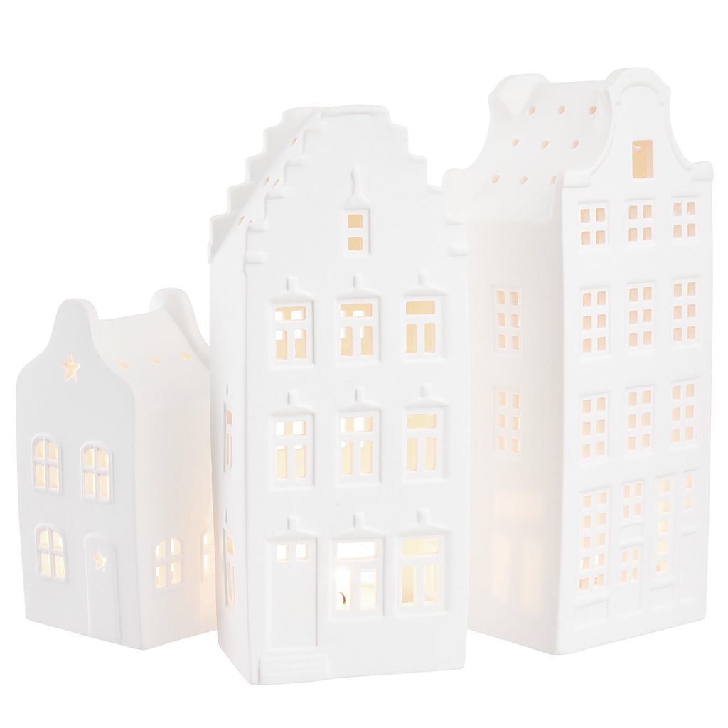 Dekoratívne čajové sviečky sú krásnou tradíciou v zimnom a vianočnom období. Amsterdamský dom na čajové sviečky je vyrobený z bielej keramiky a láskyplne navrhnutý s mnohými oknami cez ktoré sa svetlo atmosfericky trblieta. K dispozícii aj ďalšia varianty.