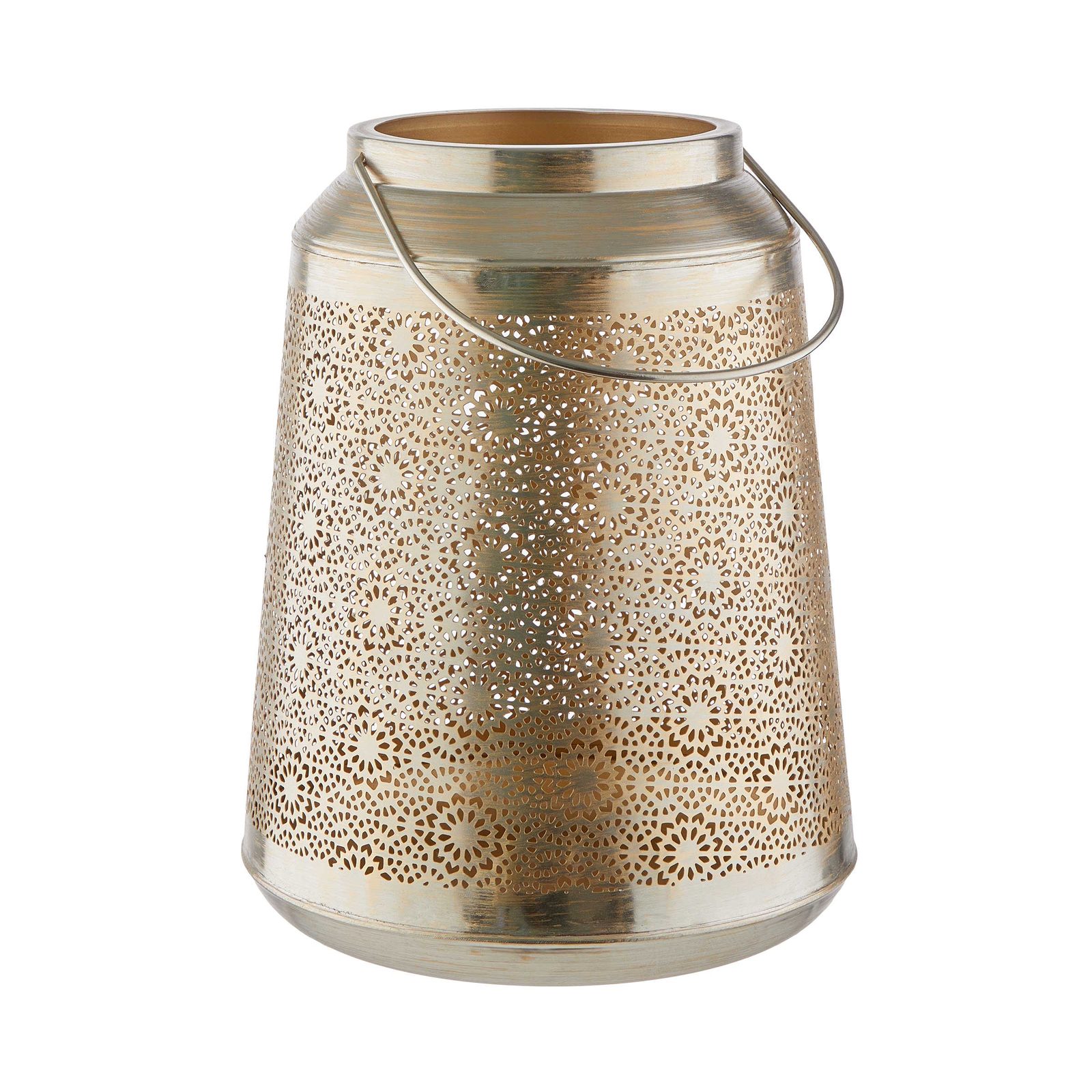 Kvetinový dierkovaný vzor, moderný mierne sa zužujúci tvar a trblietavá zlatá farba: to sú tri skvelé dôvody, prečo má železný lampáš BLOOMY NIGHTS hrať hlavnú úlohu medzi Vašimi dekoráciami alebo na prestretom stole. Štvrtý dôvod objavíte, akonáhle Vám v lampe zaiskrí plápolavé svetlo sviečky. Predáva sa aj v ďalších veľkostiach, ideálne kombinujte.