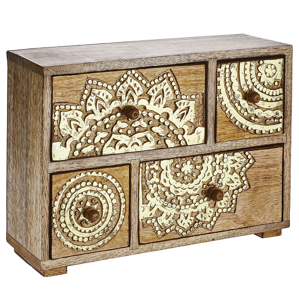 Malá, ale mocná: skrinka BALI so zásuvkami z mangového dreva so zlatou rezbou je truhla na poklady, ktorá vyzerá skvele na malej skrini, komode alebo nočnom stolíku. Môžete do nej uložiť svoje šperky alebo iné poklady.