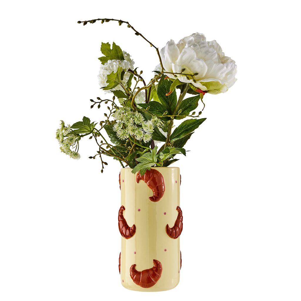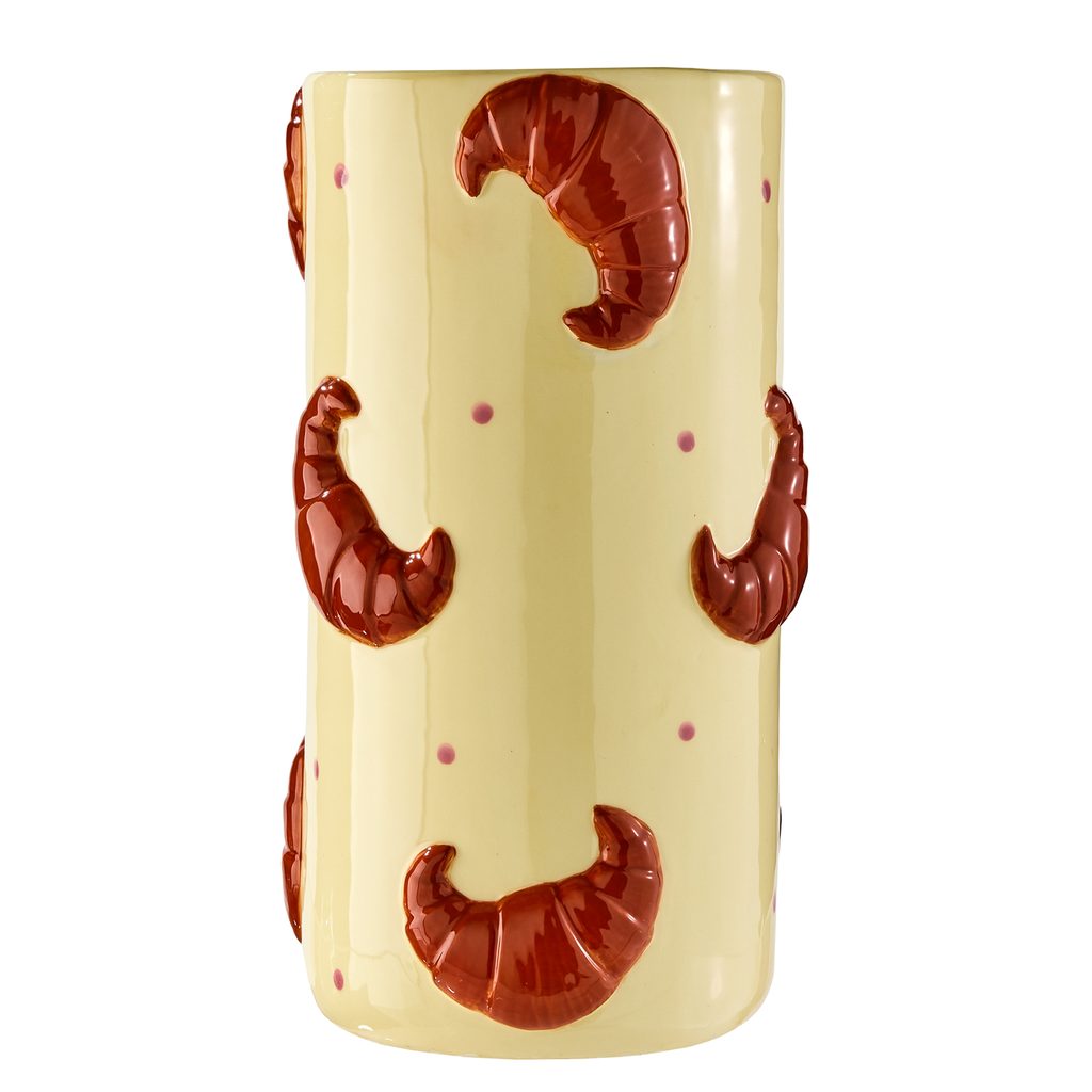 Pokiaľ skrátka nedokážete odolať čerstvo upečenému chrumkavému croissantu, potom si na Vašom stole ľahko nájde miesto aj keramická váza CROISSANT. Táto váza s grafickým motívom croissantu nielen evokuje vášeň pre francúzske pečivo, ale svojim originálnym tvarom zároveň dodáva priestoru nádych hravosti.