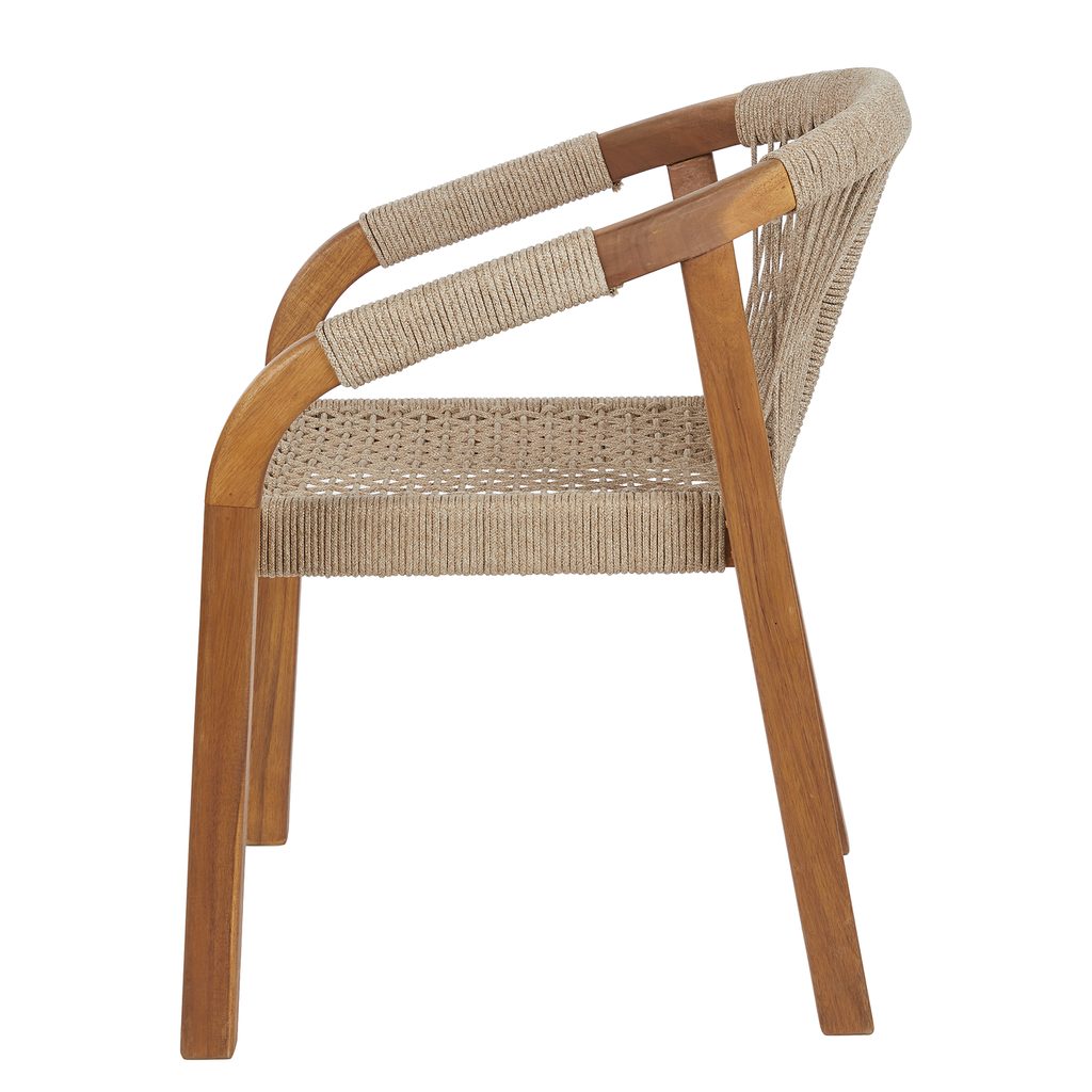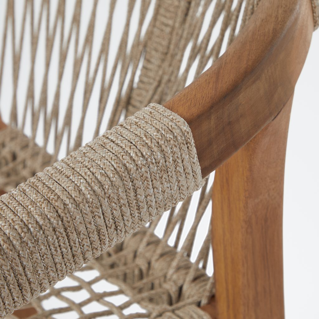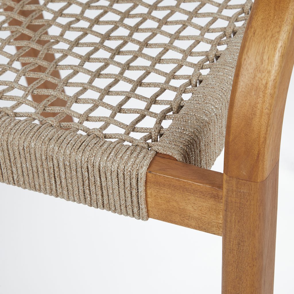 Záhradná stolička BAYONNE skvele doplní Váš pohodový vonkajší životný štýl. Táto sada dvoch stoličiek s podrúčkami je vyrobená z prírodného akáciového dreva a doplnená moderným výpletom z polyesterového lana. Doprajte si výnimočné pohodlie pri sedení na terase či záhrade.