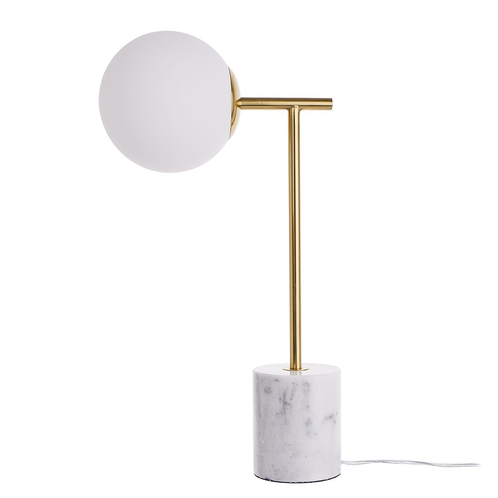 Chladný mramor, kov vo farbe mosadze a matná biela sklenená guľa: stolná lampa LUNA kombinuje tri obľúbené materiály v minimalistickom, čistom dizajne. Táto lampa sa stane ozdobou moderných, elegantných interiérov, kde poskytne príjemné a neoslňujúce svetlo, ideálne napríklad ako ambientné osvetlenie.