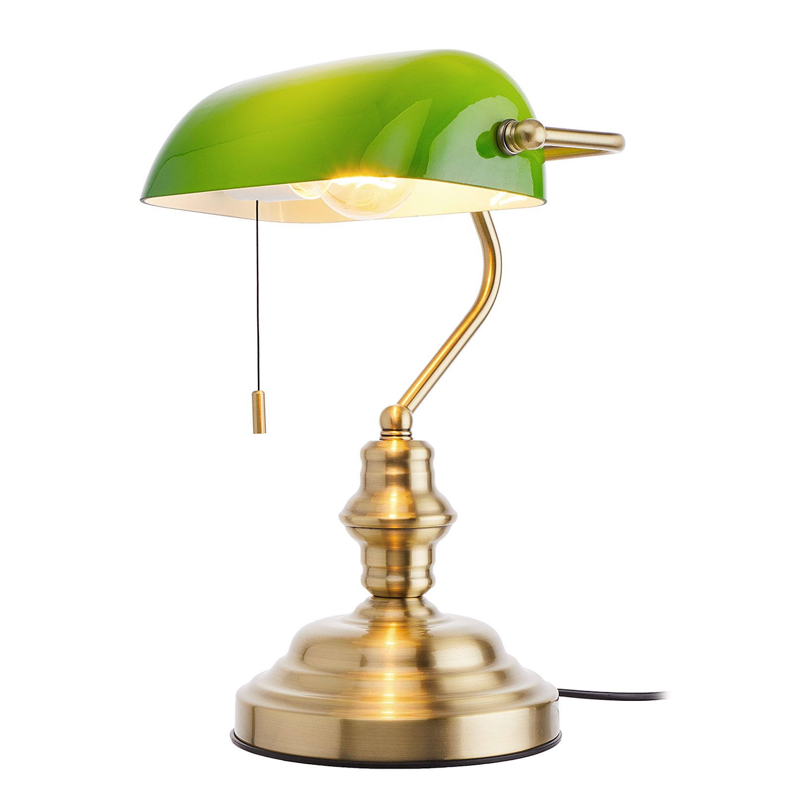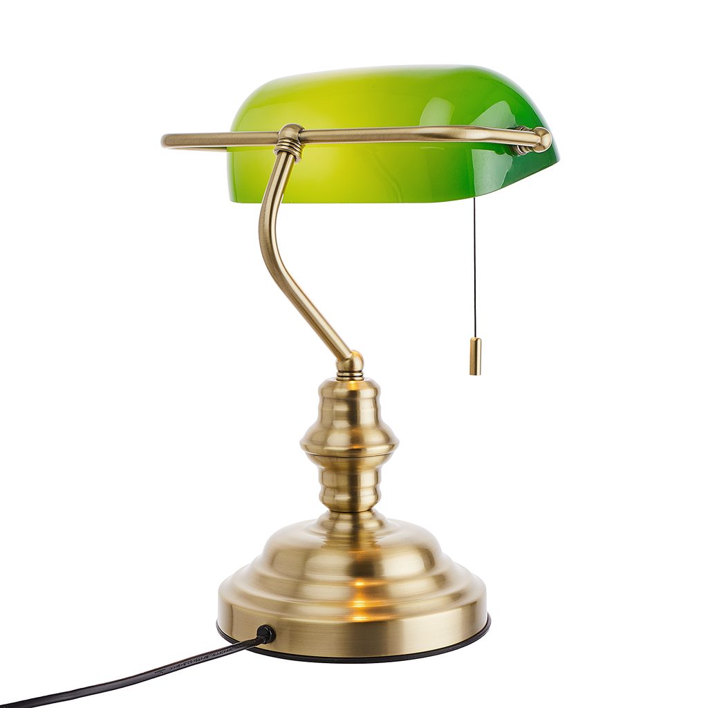 Stolová lampa SENATOR so starozlatým kovovým podstavcom a zeleným skleneným telom pripomenie klasické lampy z knižníc a bánk. S pohyblivým tienidlom si môžete svetlo nasmerovať na pracovnú plochu. Skutočná klasika, ktorú je možné kombinovať aj s moderným nábytkom.