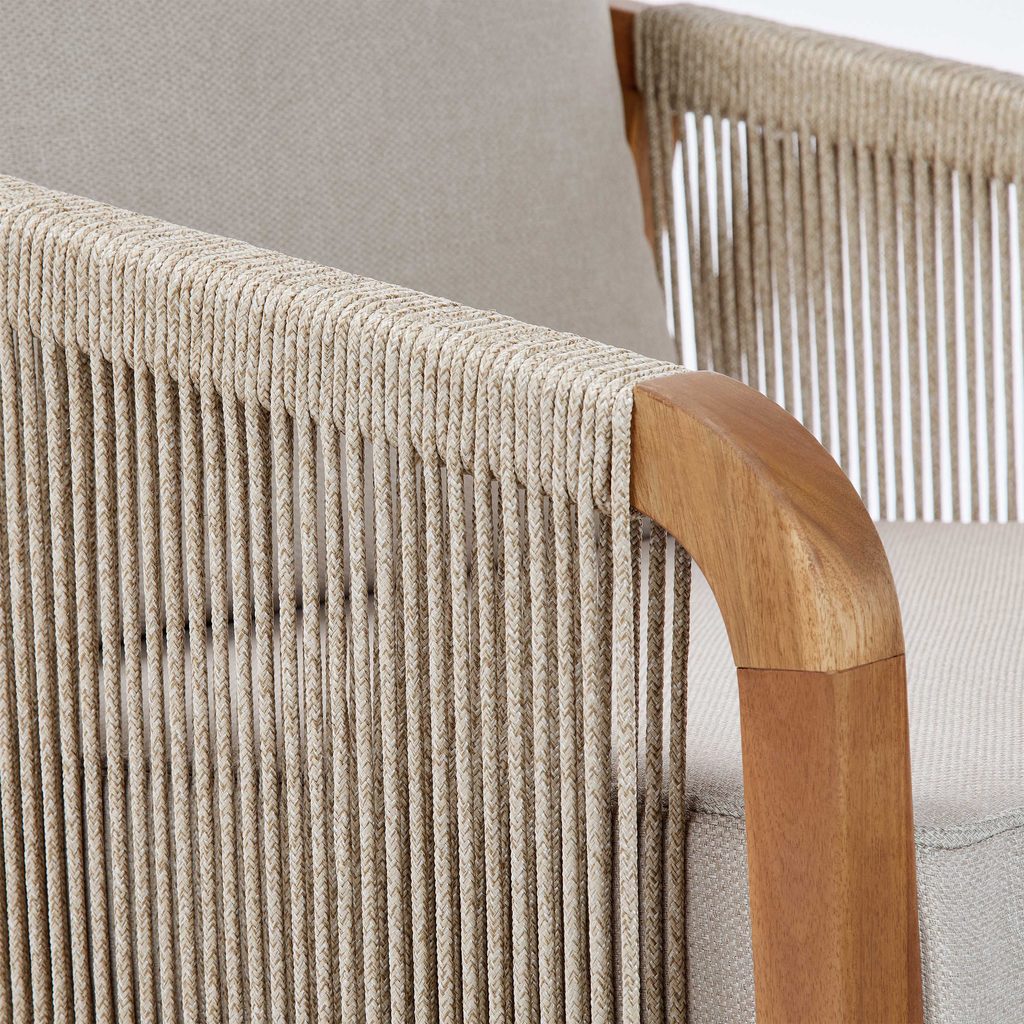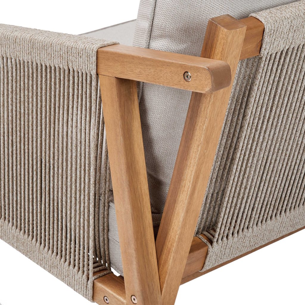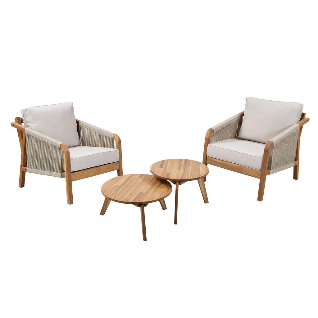 Prírodné farby, pravé akáciové drevo a módne povrazové šnúry na podrúčkach a operadlách: vonkajšia sada záhradného nábytku ROPE ISLAND má všetko, čo potrebujete, aby Vaša jarno-letná relaxácia na terase alebo balkóne bola ešte krajšia. Príjemné čalúnenie ponúka vysokú úroveň pohodlia pri sedení a vďaka zipsu ho možno v prípade potreby ľahko sňať a ručne vyprať. Okrúhle stolíky z agátového dreva zvádzajú svojim elegantným tvarom a krásnou povrchovou úpravou dreva. S touto sadou môžete vytvoriť skutočne pohodlné a praktické posedenie pre 2 osoby.
