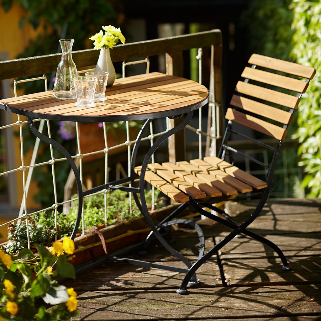 Materiál: agátové drevo bez povrchovej úpravy, pozinkovaný kov ošetrený práškovou farbou