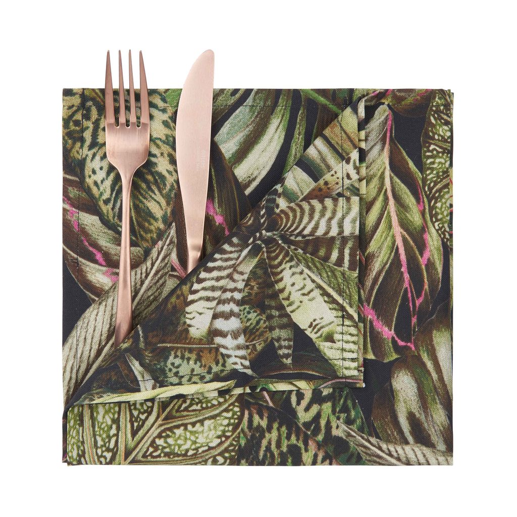 Obrúsok ESCAPE 45 x 45 cm sa pýši tmavými exotickými listami v jungle štýle. Tento exkluzívny vzor vznikol na základe inšpirácie našich dizajnérov pri ručne maľovaných predlohách a digitálnej potlači s obzvlášť detailným rozlíšením tlače na obruse nádherne vynikne. Rovnako tak kvalitná je aj 220 gsm ťažká bavlna v naozaj pevnom a hustom úplete (Half Panama úplet). V sérii ESCAPE sú k dostaniu obrusy rôznych veľkostí, stolé behúne i obrúsky.