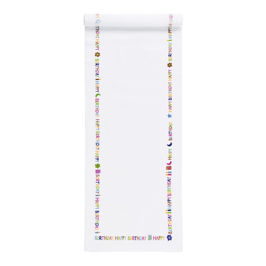 Narodeninový oslávenec má právo sa nechať hýčkať originálnymi želaniami, pozornosťami a veselou dekoráciou. Tento ľahučký behúň na stôl HAPPY BIRTHDAY z čistej bavlny má na okraji farebnú výšivku s nápisom "Happy Birthday", s malými kvietkami, sviečkami, hviezdičkami, mesiačiky a darčekmi. Mimochodom darčeky sa budú skvele vynímať na behúni Happy Birthday, najlepšie hneď vedľa narodeninovej torty. Navyše je k tomuto obrúsku k dostaniu aj vhodný behúň na stôl.