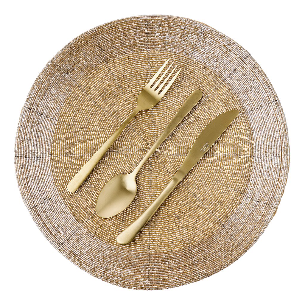 Ohromte svojich hostí týmto nádherným okrúhlym prestieraním v zlatom prevedení. Vrchná strana je zdobená nespočetným množstvom maličkých šnúrok s korálkami, ktoré dodávajú prestieraniu oslnivý lesk a ligot. Okraj je zakončený asi 5 cm širokým lemom tón v tóne, čo dodáva prestieraniu elegantný vzhľad. Toto prestieranie je samo o sebe krásnou dekoráciou pre decentne ladený stôl, ale skvele sa hodí aj do kombinácií s ďalšími lesklými či farebnými prvkami, pokiaľ máte radi výraznejšiu výzdobu.