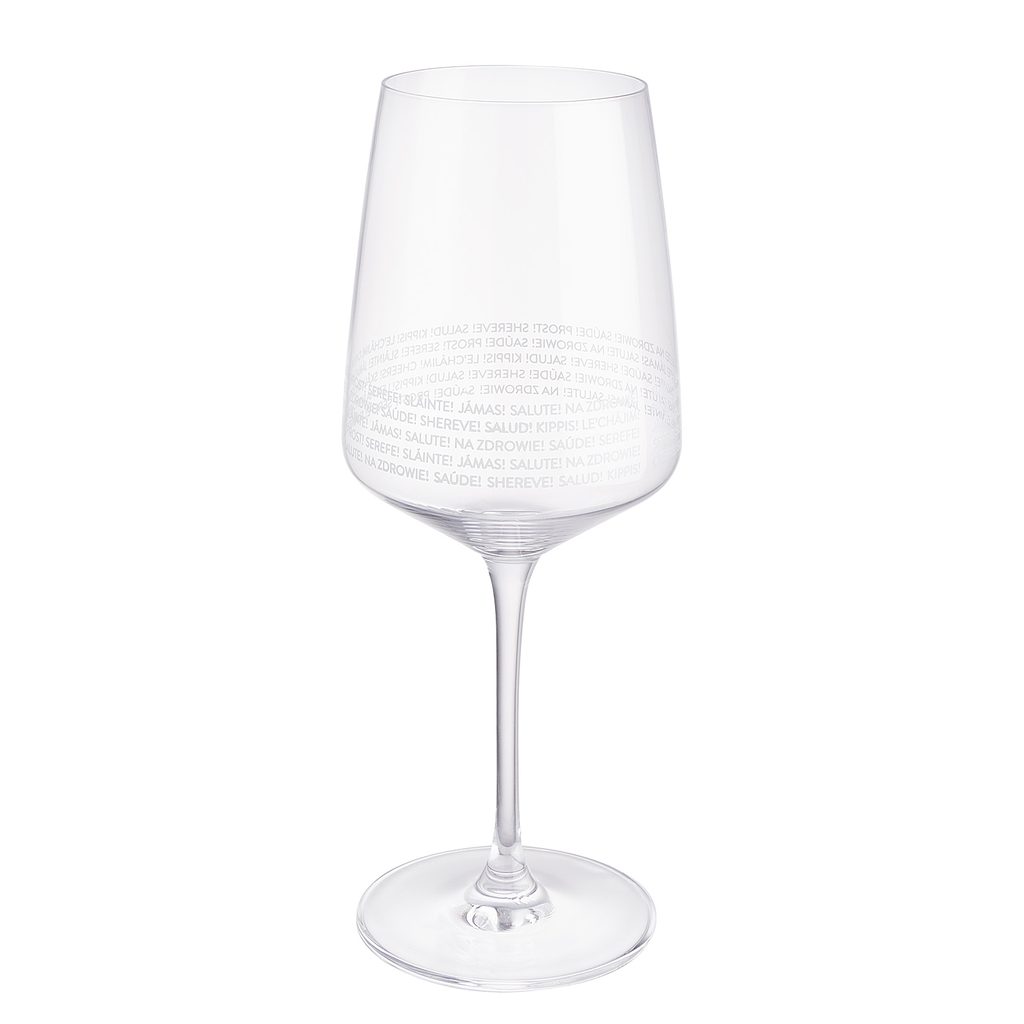 Moderný pohár na víno SALUTE hovorí „na vaše zdravie“ v mnohých rôznych jazykoch. Veľkosť pohára na víno z pravého krištáľového skla je vhodná najmä pre červené víno - čo zvýrazňuje aj drobné nápisy na pohári.