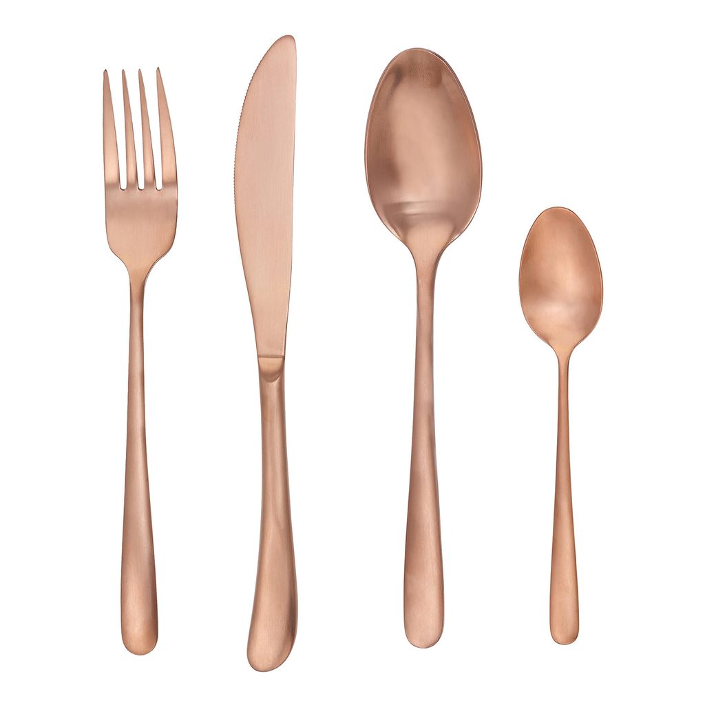 S príborom KINGS vo vzhľade ružového zlata bude vaša tabuľa skutočne kráľovská. Nôž, vidlička, lyžica a čajová lyžička perfektne padnú do vašej dlane a vďaka svojmu modernému dizajnu nasadia vášmu stolovaniu korunu. Vyrobené z ušľachtilej ocele. Dostupné i v dekore matného striebra a žltého zlata.