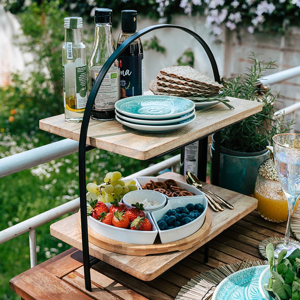 Bocadillos, tapas, malé španielske chlebíčky a výborné chuťovky ako datle v slanine teraz naservírujete na stôl na etažéri MANGO DAYS z mangového dreva a kovu. Dve hranaté poschodia pôsobia sofistikovane a vkusnejšie než etažéry okrúhle, čo absolútne zodpovedá neformálnemu štýlu tapas barov a španielskych rýchlych bistier.