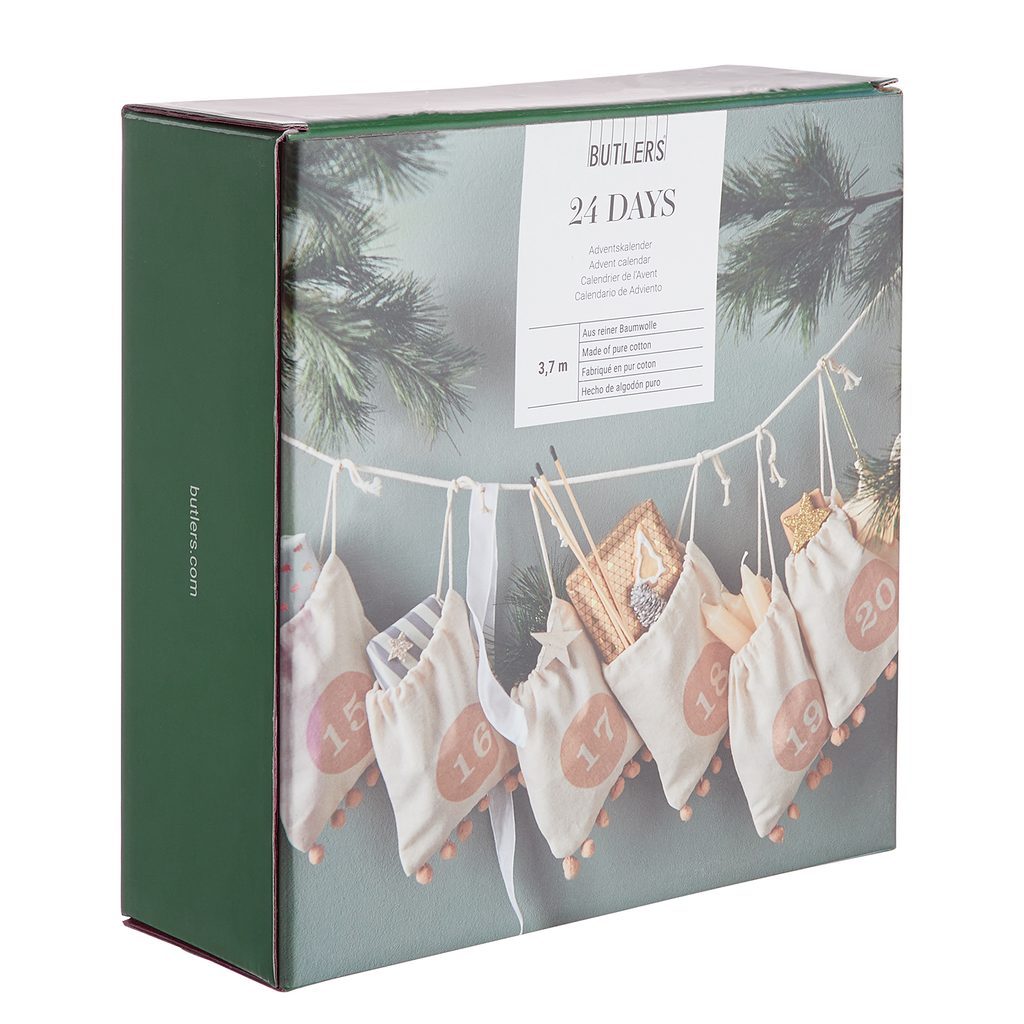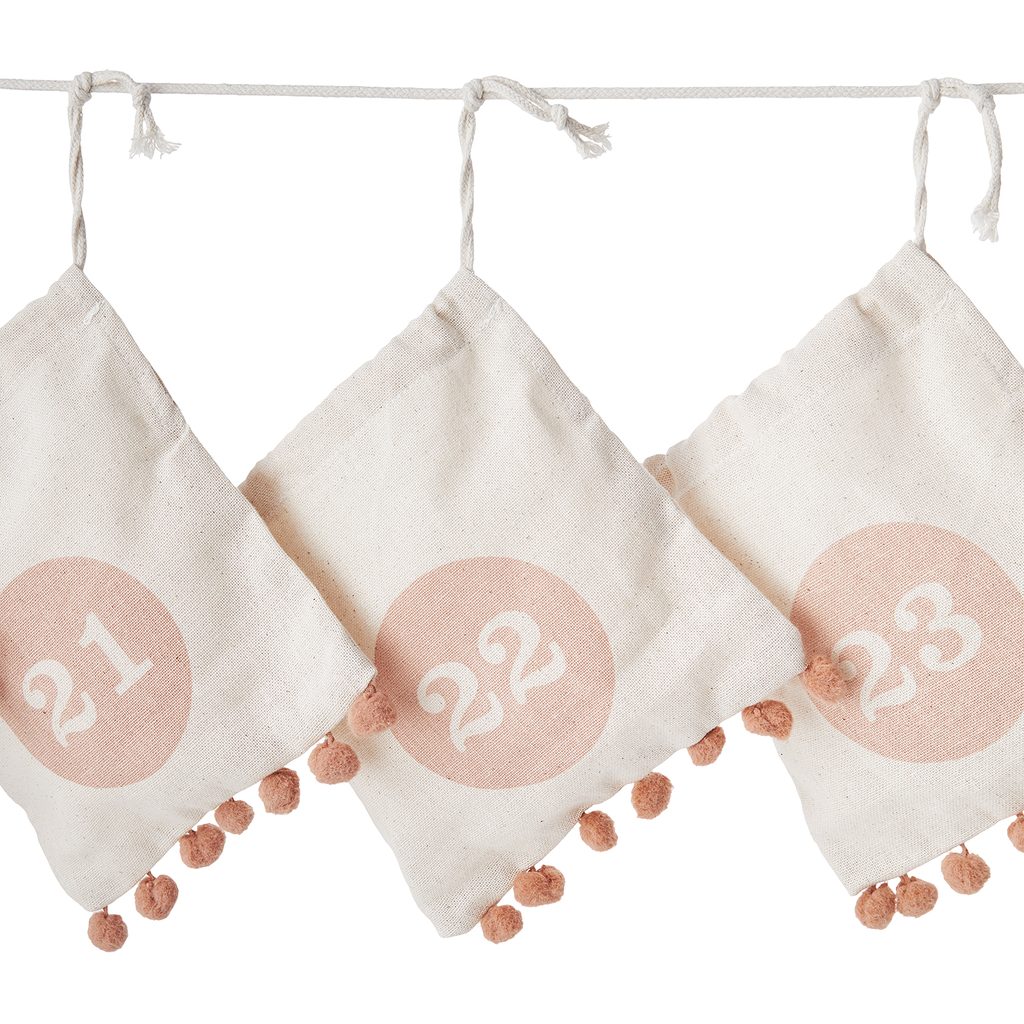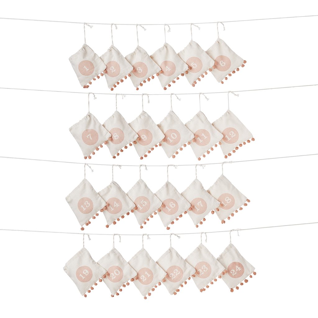 Váš adventný kalendár je každý rok plný prekvapení a s 24 denným adventným kalendárom to vidíte na prvý pohľad. 24 sáčkov vyrobených z prírodnej bavlny, zdobených roztomilými bambuľkami, je ozdobne zoradený na povrázku - a všetky len čakajú, až sa Vám oči rozžiaria každý decembrový deň pred Vianocami.